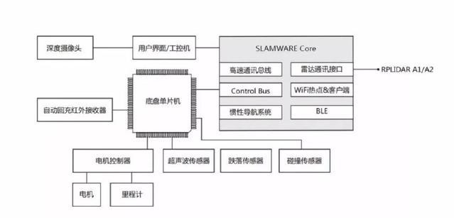 內部結構中,主要由激光雷達傳感器、深度攝像頭、超聲波及防跌落傳感器,模塊化定位導航系統SLAMWARE、等核心硬件組成。使其擁有可靠、易用的自主定位導航解決方案,多傳感器融合配合導航算法,能更靈活的規劃機器人行走路線。